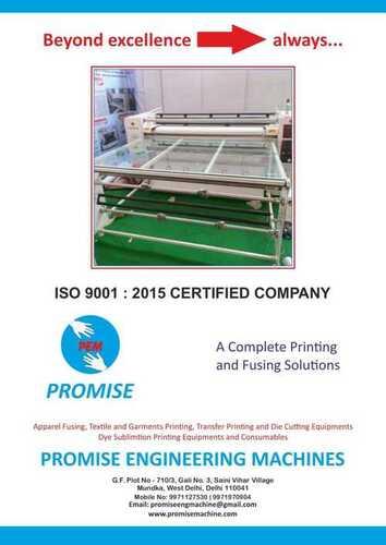 We Promise Engineering Machines started our business in 2013, are actively involved in manufacturer and supplier of finest quality Of Rotary Sublimation Press Machine, Paper Jogger Ma . Our provided products are highly demanded among our clients for their supreme quality and sturdy construction features. These products are designed and manufactured from top grade material in full compliance with present industry norms under the assistance of best ... View More